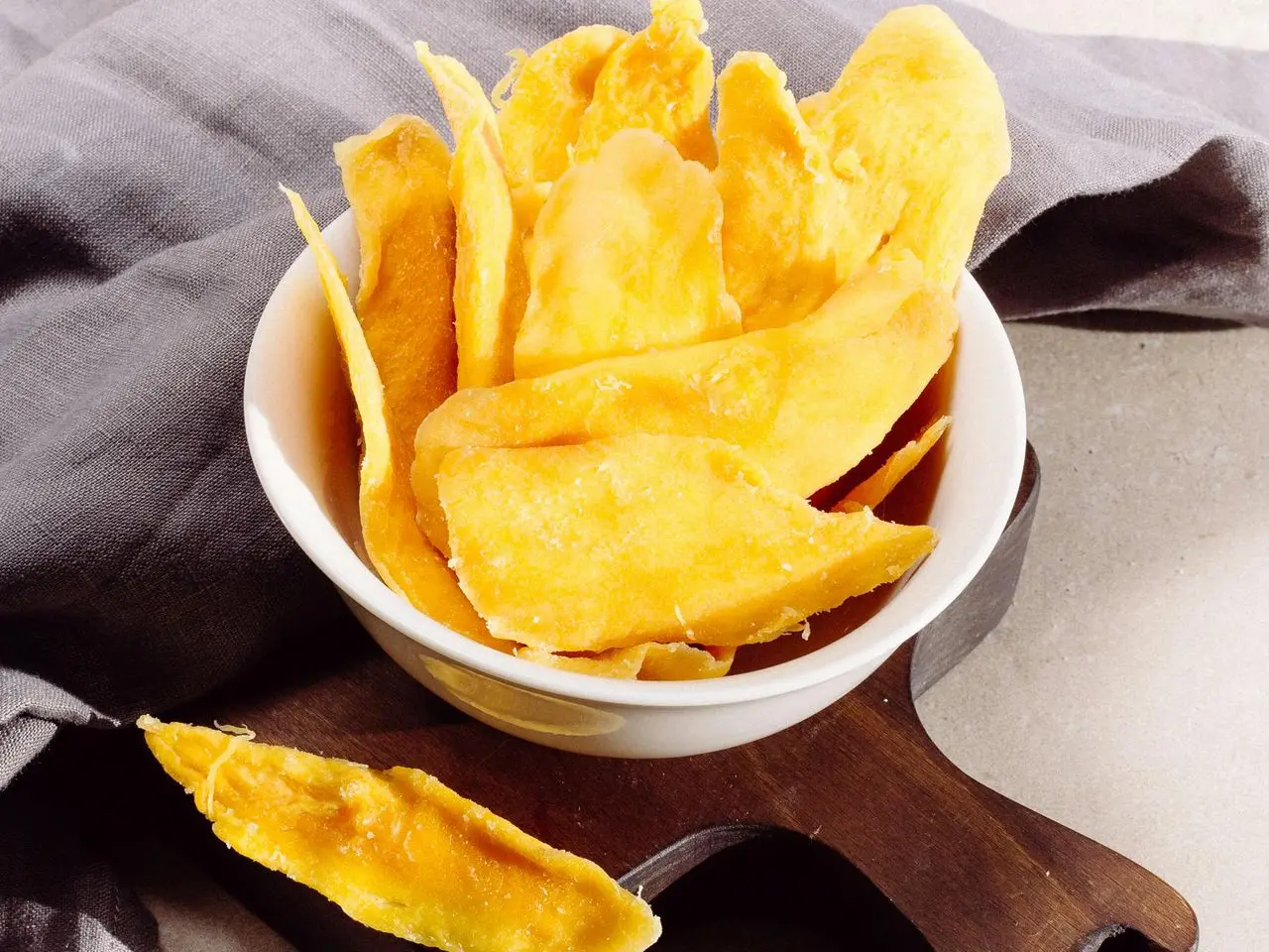 甜美、嚼勁十足且天然美味的乾芒果片,成為熱帶風味、富含維他命的小吃。